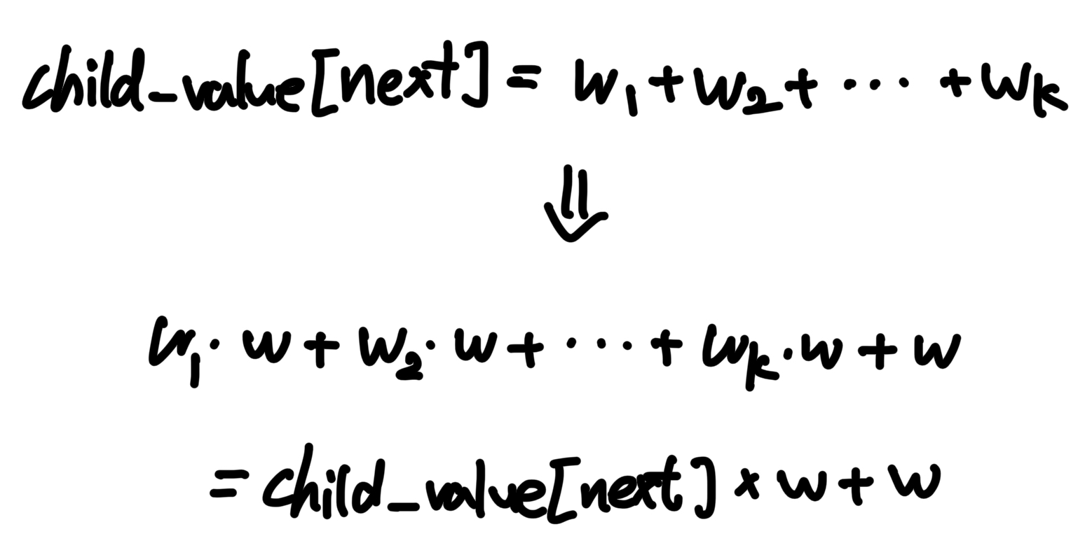 child_value[next]를 이루는 k개의 경로에 대하여 각 가중치를 w1, w2, ..., wk라고 할 때, now에 도달하는 가중치는 w1 * w + w2 * w + ... + wk * w + w입니다. 이는 곧 child_value[next] * w + w로 정리할 수 있습니다.
