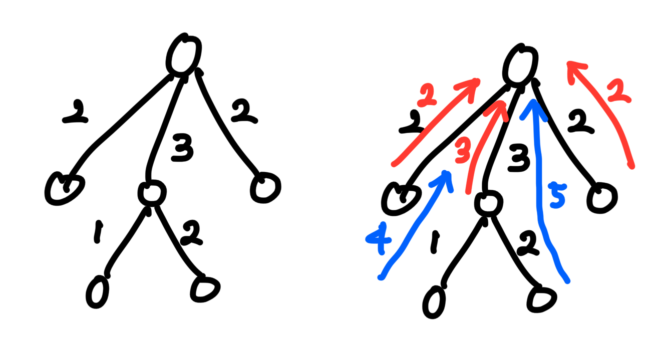이번에는 now와 next의 관계를 통해 next가 루트인 서브 트리의 모든 정점에서 now에 도달하는 가중치의 총합을 구해봅시다.