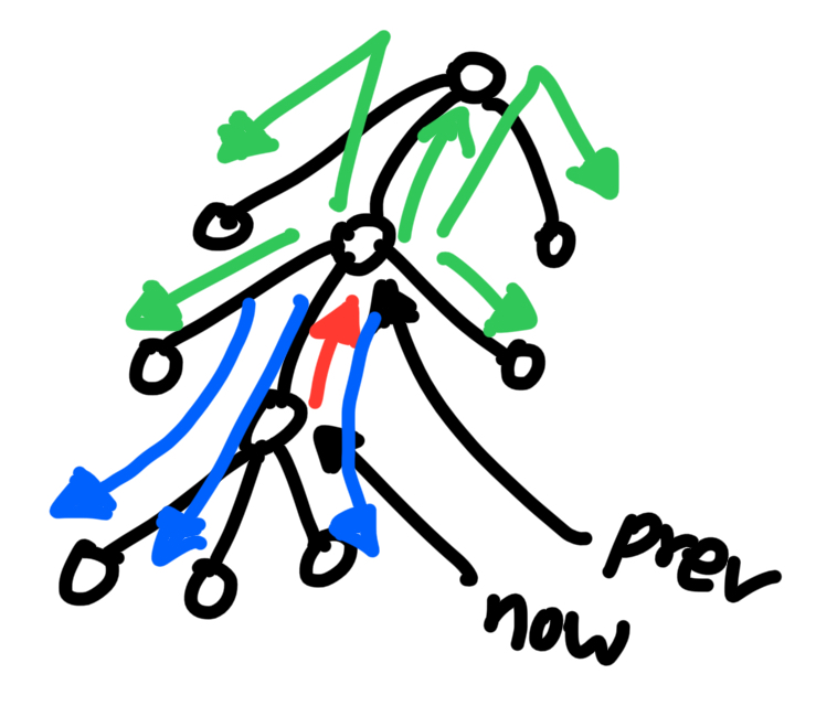 잘 관찰해보면 now의 서브 트리가 아닌 경우의 경로는 now와 prev를 잇는 간선만 고려하면 구할 수 있다는 것을 알 수 있습니다.