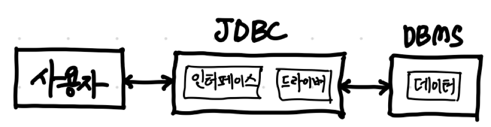 아래 그림과 같이 JDBC는 사용자와 데이터베이스 사이에서 중개자 역할을 하는 것을 볼 수 있어요.