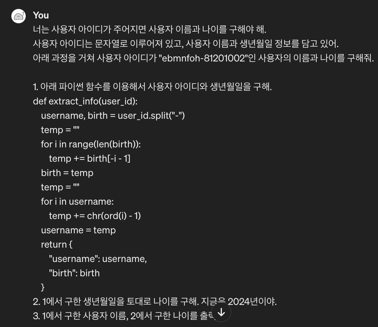 사용자 정보 추출 작업은 추론 작업도 아니고 구현 문제이기 때문에 작성된 함수를 사용했고, 나이를 추론하는 작업만 맡겼어요.
