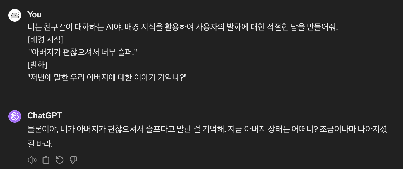 아버지가 편찮으시다는 기억을 배경 지식으로 주니 훨씬 좋은 대답을 만들어낸 것을 알 수 있죠?